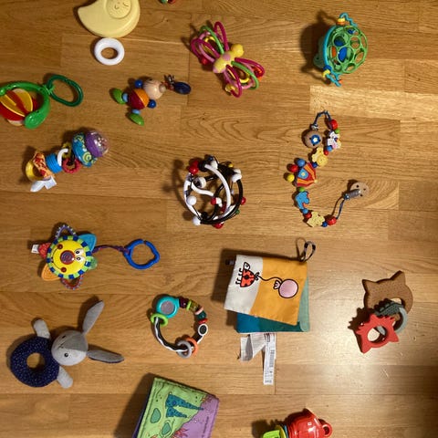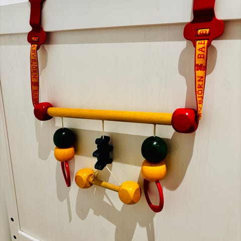 Mummi treleker maracas i rosa og gul med trehåndtak. Passer som musikkinstrument for barn.