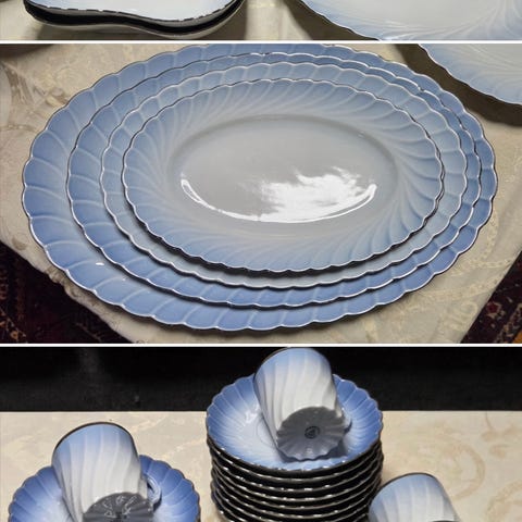 Bogstad hvit kaffeservise til salgs. Salget består av 11kaffekopper, 12 skåler og 13 asjetter. 5 tekopper og 10 skåler. Fløtemugge, sukkerskål, kaffe/tekanne, oljelampe og 2 lysestaker.