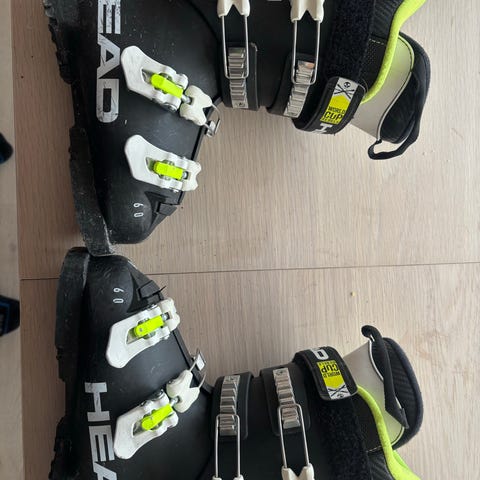 Head skistøvler med størrelse 26,5. Fargene er svart og grønn med hvite spenner. Skistøvlene har solide såler med godt grep. Egnet for alpinski.