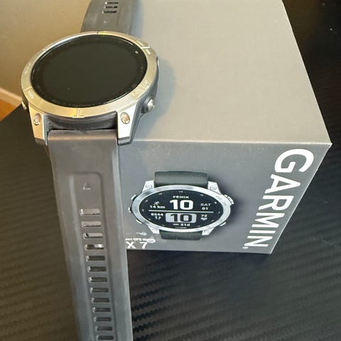 Selger pentbrukt Garmin Fenix 7 smartklokke med grå reim. Klokken har flere funksjoner for helse og aktivitetsmåling, inkludert pulsmåling og GPS, betaling, berøringsskjerm. Passer for bruk i ulike trening og utendørsaktiviteter. Ladekabel følger med.
