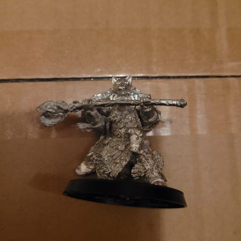 Warhammer 40K Dreadnought figurine i grå plast. Detaljert modell av kjøretøy/robot fra Warhammer 40K-serien. Passer til samling eller bruk i Warhammer bordspill.