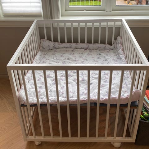 Pute og teppe (øverst) som passer til 80x80 lekegrind selges. Vi måtte ha en med kant for å forhindre at små babyføtter hang seg fast.