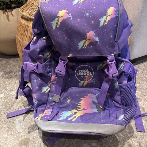 Ryggsekk laget av stoff, designet for unisex bruk. Sekken har hovedrom med glidelås og sidelommer i nettmateriale. Den har justerbare skulderstropper for komfortabel bæring. Sekken har et mønster i blått med fargerike detaljer og et gult innerfôr.