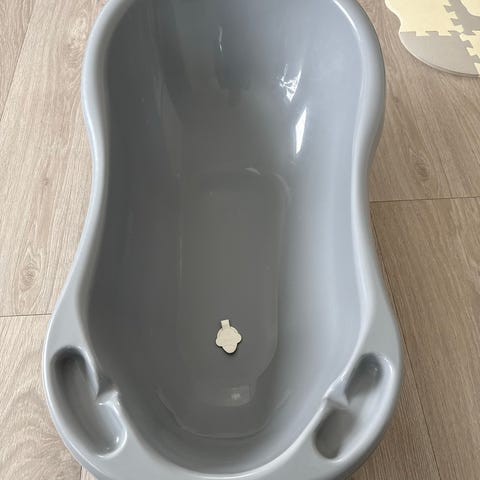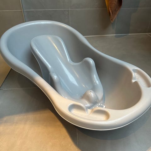 bébé-jou badestol i grå og hvit farge. Laget av plastmateriale. Designet for å gi støtte og komfort under bading.