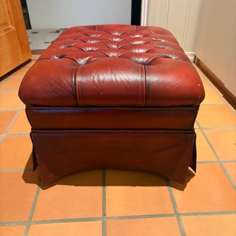 Stilig puff i skinn-imitasjon selges. Fargen er brun/grå.