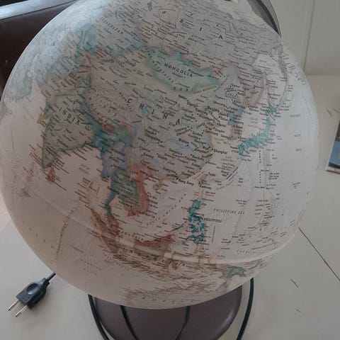 Eldre globus fra Scan-globe København selges. Som du ser på bildene er det lys i globusen. Foten er av tre og rammen av metall. Littegrann avskalling på toppen av globusen, se bilde. Høyde 39 cm Kom gjerne med bud.