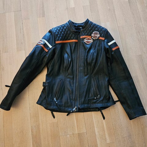 Fin jakke fra Harley Davidson, innerfor er til å ta ut. Str XL. Deilig å myk i skinnet. Alle glidlåser virker.