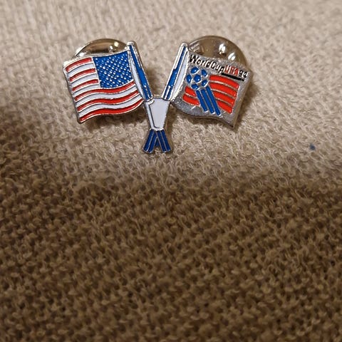Pin med motiv av amerikansk og norsk flagg, samt en fotball og årstallet 1994. Passer som samleobjekt eller dekorasjon.