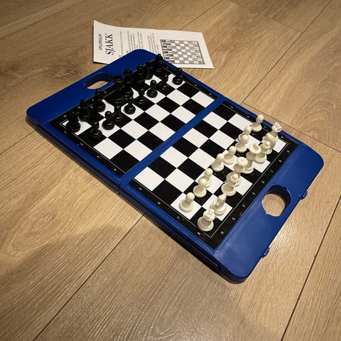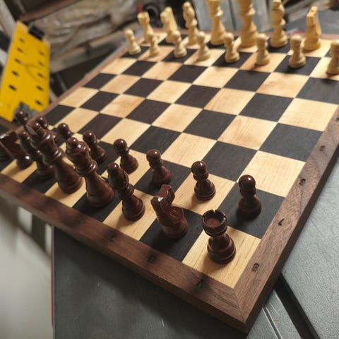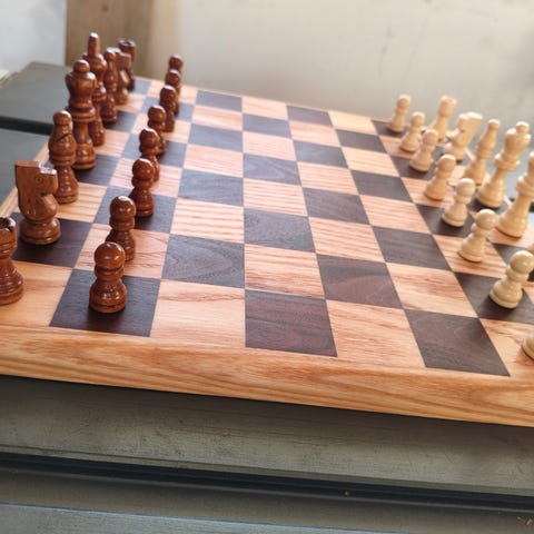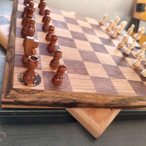 Sjakkbrett i tre med sjakkbrikker