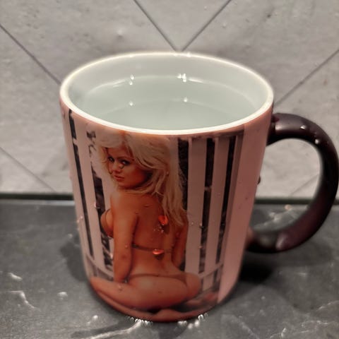 95 krMagisk kopp, skifter farge ved varm drikke. Lettkledd dame. Kan sendesMelhusLegg til som favoritt.