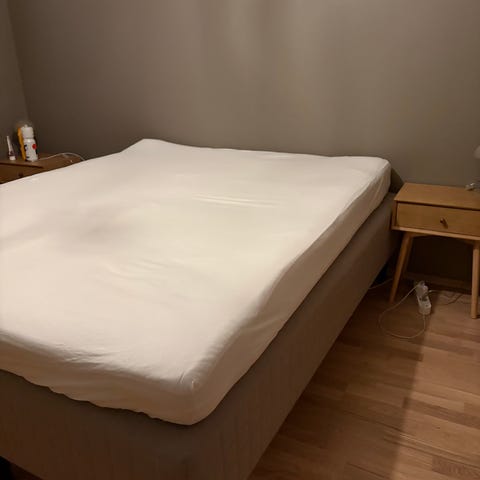 IKEA Skårer seng med beige stofftrekk og svarte ben. Sengen har en enkel og nøytral design!