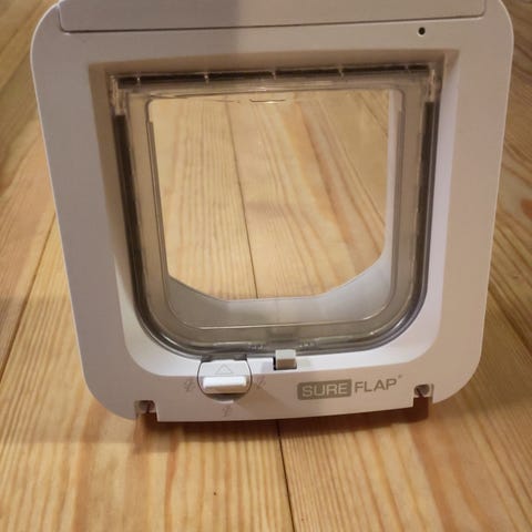 Helt ny katteluke, merke SureFlap. Leser av kattens id-chip i nakken, hvis katten ikke har chip så kan egne halsbånd-tagger kjøpes separat. Man programmerer kattens id-chip nummer inn i luka sånn at bare de kattene du ønsker kan bruke luken. Aldri tatt ut av esken. Ny pris er 1499,-. Selges for 1000 kr.