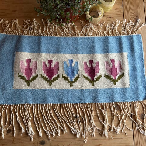 Den er i fin vintage stand, ikke falmet eller gammel lukt. Lett slitasje på noen av frynsene som er noe kortere enn andre. Henges pent opp med to tynne stifter. Kan også brukes som gulvteppe.