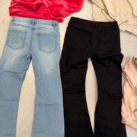 Barnetøy i flere farger, størrelse 146-152, beregnet for gutt. Inneholder ulike plagg som bukser, gensere og skjorter i forskjellige materialer og farger.