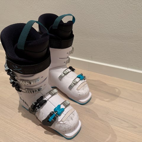 Head skistøvler i grå farge med fire spenner og polstret innside for komfort. Støvlene er designet for alpint bruk og har justerbare spenner for tilpasning.