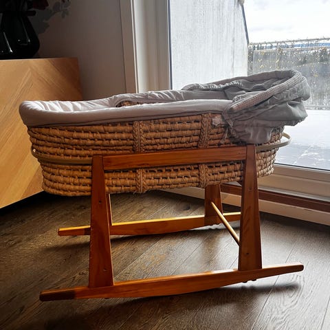 Selger en veldig fin moseskurv fra Plum & Sparrow. Kurven passer til baby fra nyfødt og opp til ca. 4 måneder. Perfekt å flytte rundt i huset – lett, praktisk og koselig