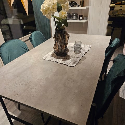 Pent brukt spisebord selges i sort beiset eikefiner med understell i stål. Nypris 4990 kr Hentes Skarnes