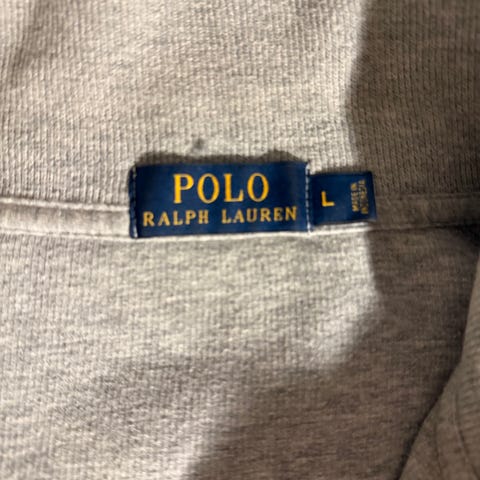 Ralph Lauren Polo genser i størrelse L for menn. Genseren har en grå farge. Den har et motiv av en bjørn kledd i klassisk Ralph Lauren-stil på forsiden.