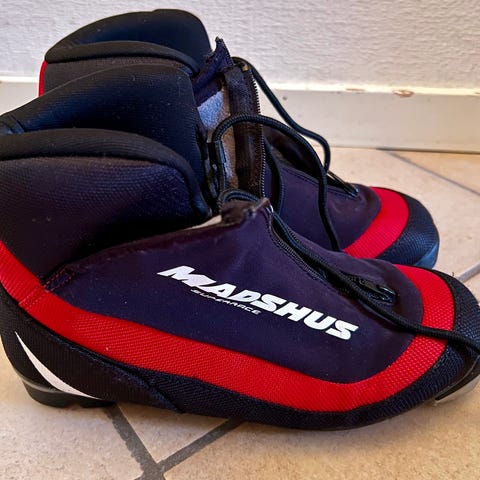 Alpina Madshus langrennsski med tilhørende sko. Ski og sko er utstyrt for langrenn og egnet for bruk på preparerte løyper. Skoene har lukkemekanisme foran og er i svart farge.