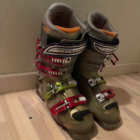 Comp 2 alpinstøvler med fire spenner og polstret innside. Støvlene er laget for alpinski og har en svart farge med grå detaljer. Passer for bruk i alpint. Str. 24,5, men virker mindre.