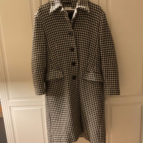 Fasongen er forholdsvis rett. Den er litt bredere over hofte/rompe, før den svinger inn nederst. Jakken har en lomme i hver side med praktisk gullfarget glidelås. Det er fem kraftige trykknapper for knepping.