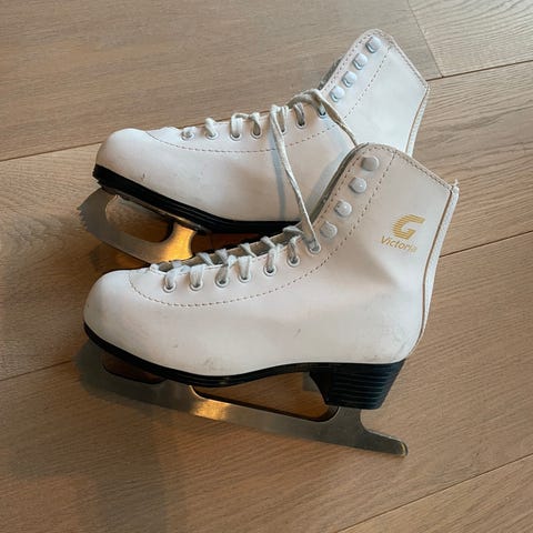Kunstløpskøyter barn i ca. størrelse 35 i hvit farge. Godt brukt. Slitt snøring. Innersåle 22cm lang.