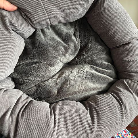Danish Design rund katteseng, hundeseng i beige farge med mønster av poter. Sengen har en myk og komfortabel overflate, og inkluderer en avtakbar pute. Egnet for små hunder eller katt