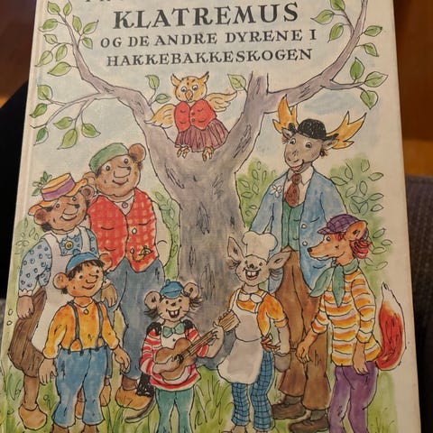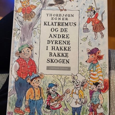 Thorbjørn Egner Klatremus og de andre dyrene i Hakkebakkeskogen barnebok. Inneholder illustrasjoner og fortellinger om dyrene i Hakkebakkeskogen.