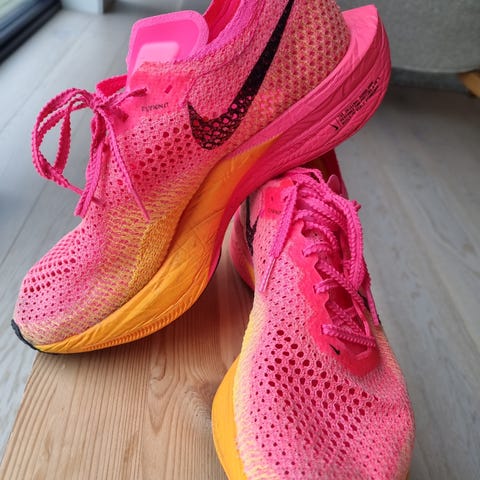 Nike løpesko i størrelse 46, designet for løping. Skoene har en fargekombinasjon av rosa og oransje med svart logo. Materialet består av pustende mesh for ventilasjon.