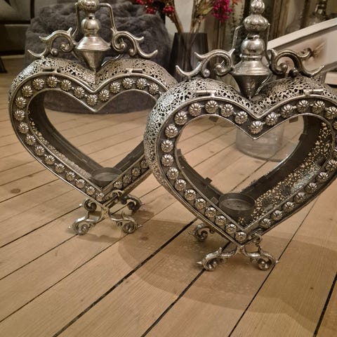 Pent brukt telysholder som er formet som hjerte til å henge opp i vindu eller andre steder.