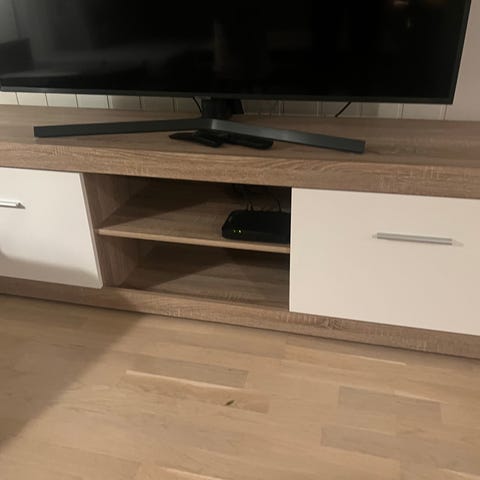 Hvit TV benk i høyglans selges. Betonglook benkeplate. I pen og god stand. Skuffer åpnes ved å dytte inn skuffene (uten håndtak).