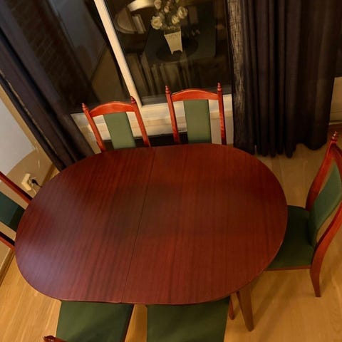 Fint brukt kjøkkenbord, noen små merker på kan og ett lite på bordet. Følger med 7 stoler fint brukt.
