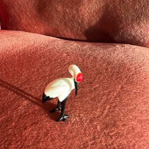 Elegant håndlaget glassfigur formet som en stork/trane. Hvitt glass med svarte detaljer, rødt nebb og lange, slanke ben i rødt glass. En dekorativ figur som passer perfekt i vitrineskap, på hylle eller som gave til en som liker kunstglass og figurer.