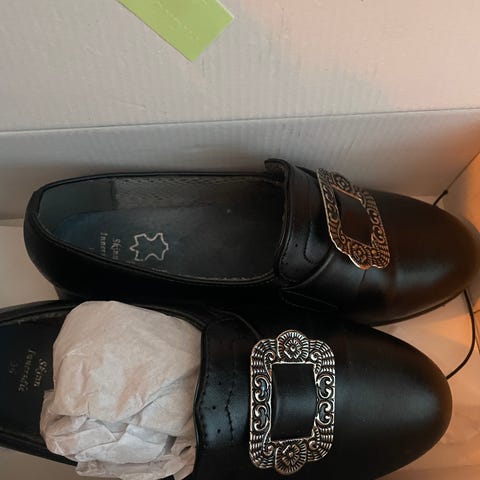 Bunadskoene ble kjøpt til17.mai i fjor, og kun brukt den dagen. Sålen er laget av skinn. Kostet 299kr.