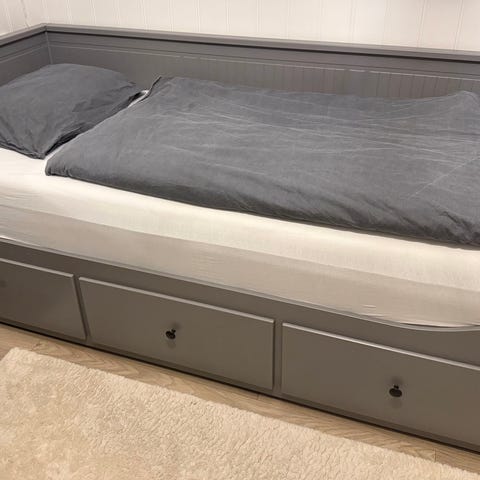 IKEA Hemnes seng med oppbevaring i grå farge. Sengen har tre skuffer under for ekstra oppbevaringsplass. Laget av trematerialer med lamellbunn. Passer til enkeltmadrass og egnet for bruk i soverom.