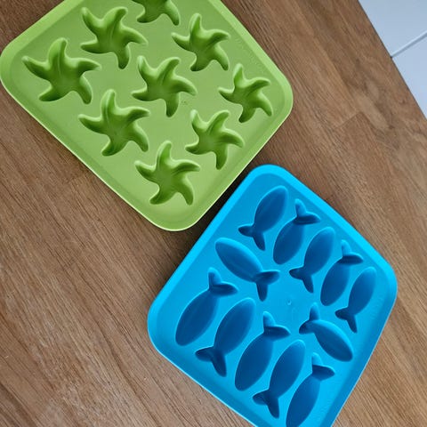 Isbitformer laget i plast. Settet inkluderer flere former for å lage isbiter i ulike størrelser og fasonger.