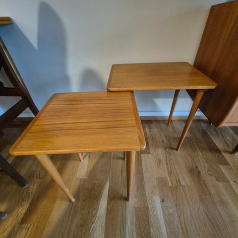Slitt men kult teak salongbord gies bort. Bordet har to "blad" som kan trekkes ut underifra. Bredd med et blad uttrekkt 76 cm og med begge blad 93 cm. Meget praktiskt til hosting/brettspill.