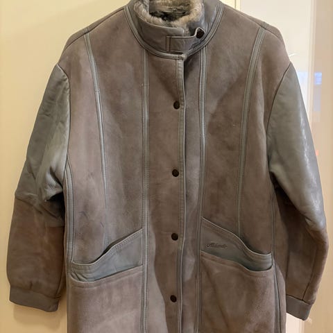 Merke Polarpels, str 36. Mørk brunt semsket skinn. Snøring i midjen og ved nederste kant, med glidelås og knapper. En innerlomme og to ytterlommer. Avtagbar hette med ekte pels. Varm jakke i god stand.