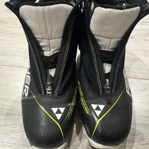 Fischer langrennssko i størrelse 36. Skoene har en kombinasjon av svart og gul farge med glidelås foran.