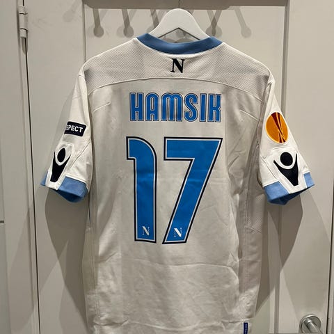 Napoli Fotballklubb banner i blått stoff med gule frynser. Banneret har trykk av klubbens logo, flere trofeer og tekst som viser klubbens titler og seiere. Signert av selveste Antonio Conte forrige uke før møtet mellom København og Napoli i Champions League.