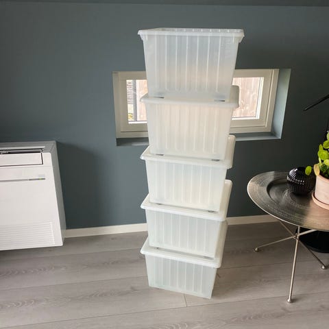 IKEA oppbevaringsbokser i tekstil, kommer i fargene rosa og blå. Boksene er firkantede og egner seg til oppbevaring av ulike gjenstander i hjemmet.