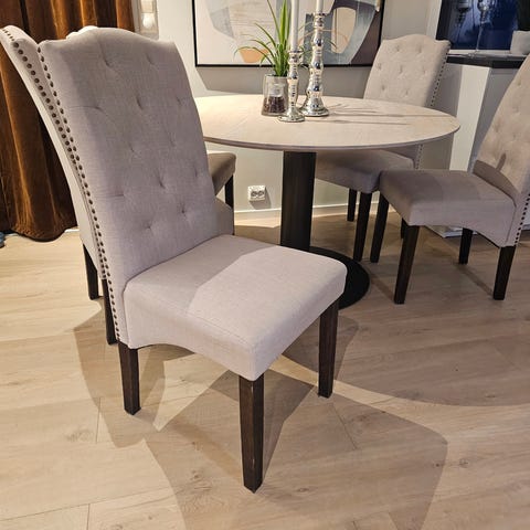 Ingen slitasje eller hull. Men 2 av stolene mangler den ringen bak. De kan følge med og kan festes tilbake.