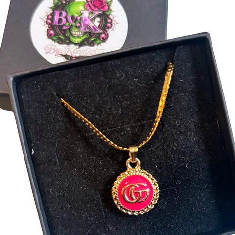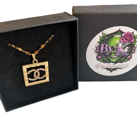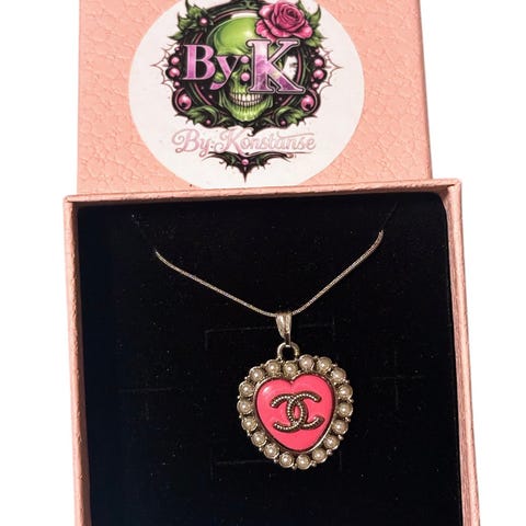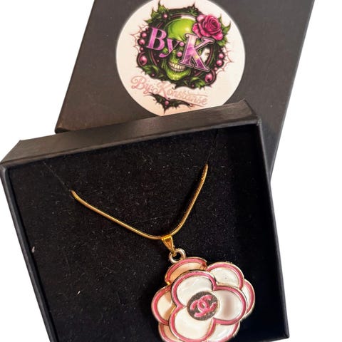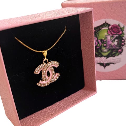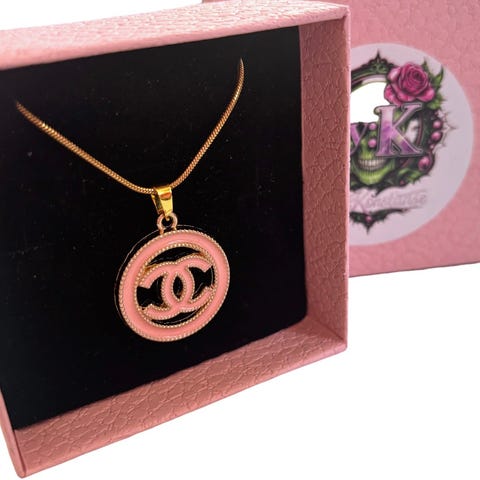 Et helt nytt Chanel halskjede, monogram CC logo, i rosa med stitchy ytterkant. Glatt overflate, m/gulltonede ytterkant, og en Chanel stemplet bakside. Da dette er re-design fra et originalt Vintage Chanel anheng om til et nydelig og søtt komplett smykke! 18K Gullbelagt allergi vennlig Rustfritt stål snake kjede, kvalitet på 45cm, +5cm ekstra regulerbar lengde lenke.