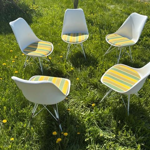 4 stk Biebl Design puter, som passer til en 5-trinns regulerbar hagestol med høy rygg. Putene er grønne og har et rutete mønster i midten. De har stropper for feste til hagestolen og seteputen kan knytes fast, så den ikke sklir.