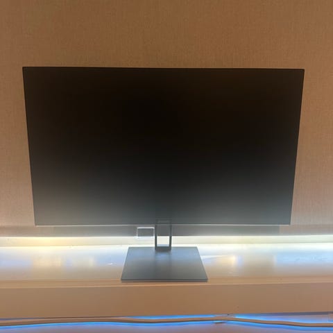 Huawei Monitor med buet skjerm. Inkluderer tilkoblinger for strøm, HDMI og DisplayPort. Monitoren har en stabil T-formet fot og et buet design som kan gi en omsluttende visningsopplevelse.