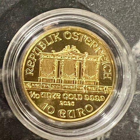 Republik Österreich 1 Unze gullmynt fra 2025 med renhet 999.9. Mynten har en verdi på 100 euro og er laget av gull.
