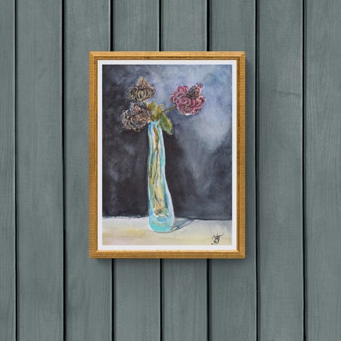 Original akvarell håndverk fineart stilleben sjarm vintage glassvase maleri