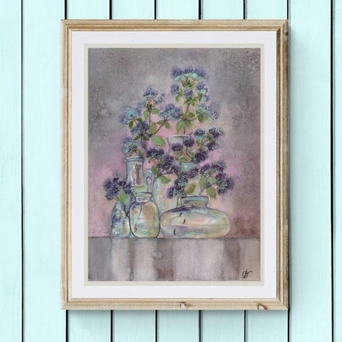 Nøkkelord: original, akvarell, veggkunst, vintage, glass, markblomster, stilleben, drøm, hus, florist, gartner, hage, planter