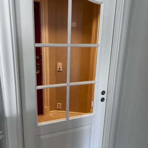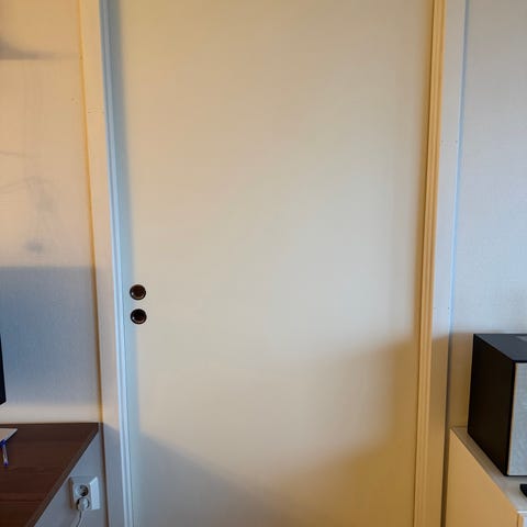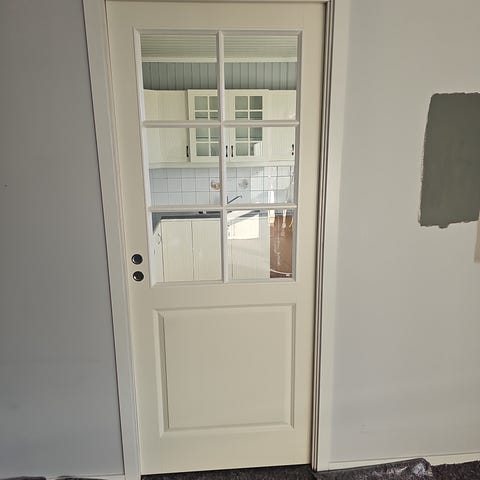 Skyvedørskarm med dørblad 204x84. Fremstår hel og fin med noen bruksmerker.