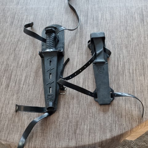 Hel og grei dykkekniv. Er bruksmerker på slira